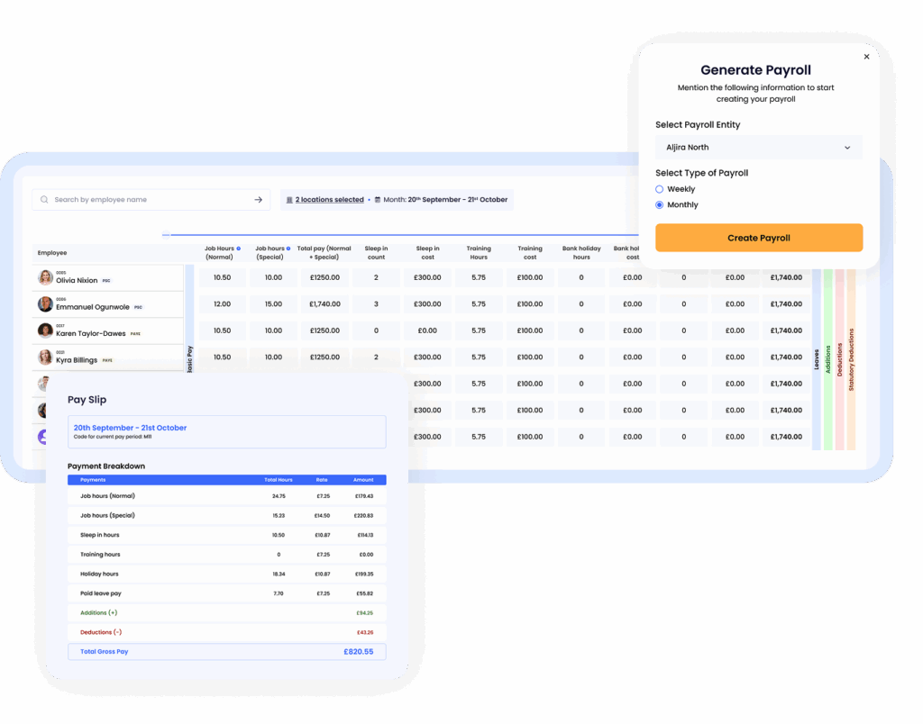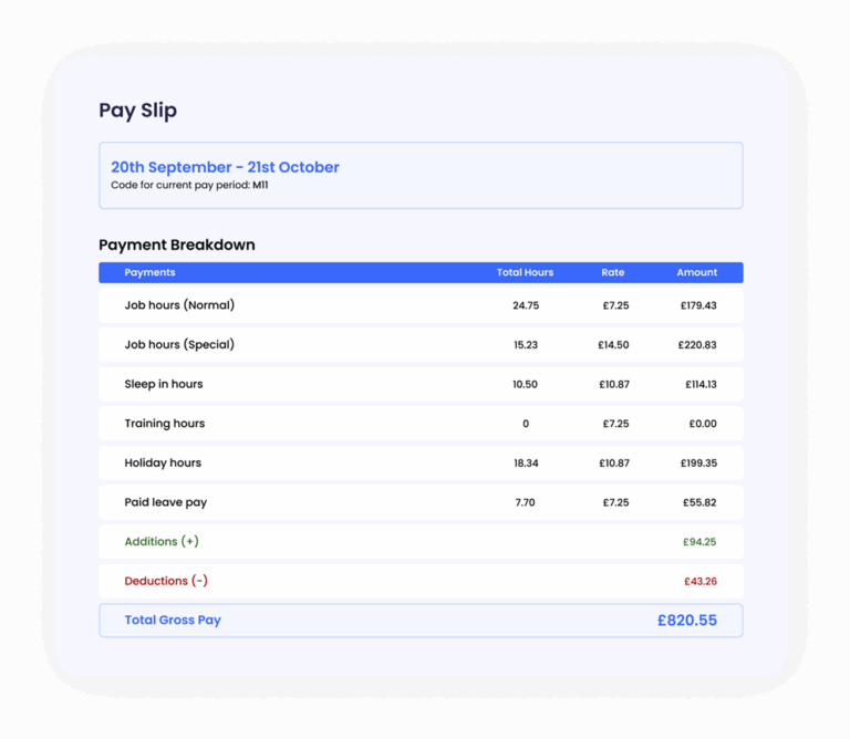 Calculate gross pay based on contracted hours, shifts worked,  mileage, and unsocial hours.